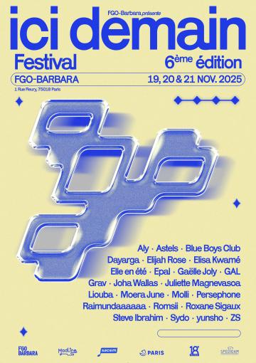 Le festival se tient dans un lieu singulier qu’on ne nomme plus, FGO-Barbara. Un lieu totalement modulable qui offre la possibilité de proposer cette expérience de festival fluide et rare, dans un seul bâtiment, répartie entre deux scènes qui se répondent par des jeux de lumières et des scénographies léchées. Une identité graphique en live qui se retrouve dès la création de l’affiche. La « touche Ici Demain » s’exprime aussi par l’art visuel, et chaque année l’esthétique du festival est confiée à un·e jeune illustrateur·ice. L’année 2025 est donc marquée par le sceau de l’univers épuré de Marion Degorce.