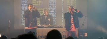 Dans le hall de FGO-Barbara, place au slam ! Une scène ouverte organisée à l'occasion de la sortie du livre Le mot qui Claque - 16 ans de slam par les éditions Les Xérographes, ouvrage qui relate l'aventure de seize années d'une scène slam dans plusieurs cafés parisiens du Downtown au Onze Bar et rassemble dans ses pages une trentaine de poètes et slameur·euses. Dans un hall plein à craquer, se sont présenté·es sur scène Kemo, Yugze Le Barde, Maiamed Ali, Madatao, Le Robert, L'Azrael, Mo Absoir, JYB, Shein B sans oublier DGIZ à la contrebasse ! Un grand moment de jongle verbale qui s'est poursuivi jusque tard dans la soirée, à mesure que se préparait en salle de concert un voyage avec la très secrète compagnie Barbès Airline...