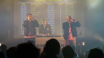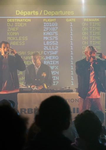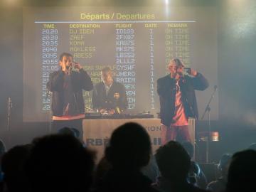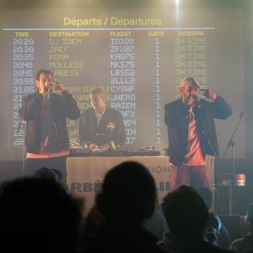 Panneaux Departure, Check In, Arrivals, Douane... à peine arrivé·es dans la salle de concert de FGO-Barbara, les spectateur·ices étaient plongé·es dans le grand bain du Barbès Airline Show ! "Ici on voyage pour pas cher" plaisantait Mockless, et pour cause, le dépaysement était garanti ! Difficile de se frayer un chemin entre les stewards, les hôtesses de l'air, et les fans de la Scred Connexion venu·es en nombre pour cette première date unique en son genre et... SOLD OUT! Sur scène, les artistes nous ont offert une myriade de prestations d'une qualité folle allant du concert, au solo de saxophone, au dj set, et en passant par le stand-up avec Zaef. Une soirée survoltée, exaltée, déchaînée ! Personne n'oubliera le passage mémorable des indémodables Koma et Mokless, ou encore de Kacem Wapalek, Busta Flex, Roots Neg, Labess à la guitare, la kickeuse 2L, l'émouvante Nawel Ben Kraïem, Mister Wolf & Chloé, DJ Idem, la prometteuse Keïla et Lidiop. Jamais dans la tendance mais toujours dans la bonne direction !