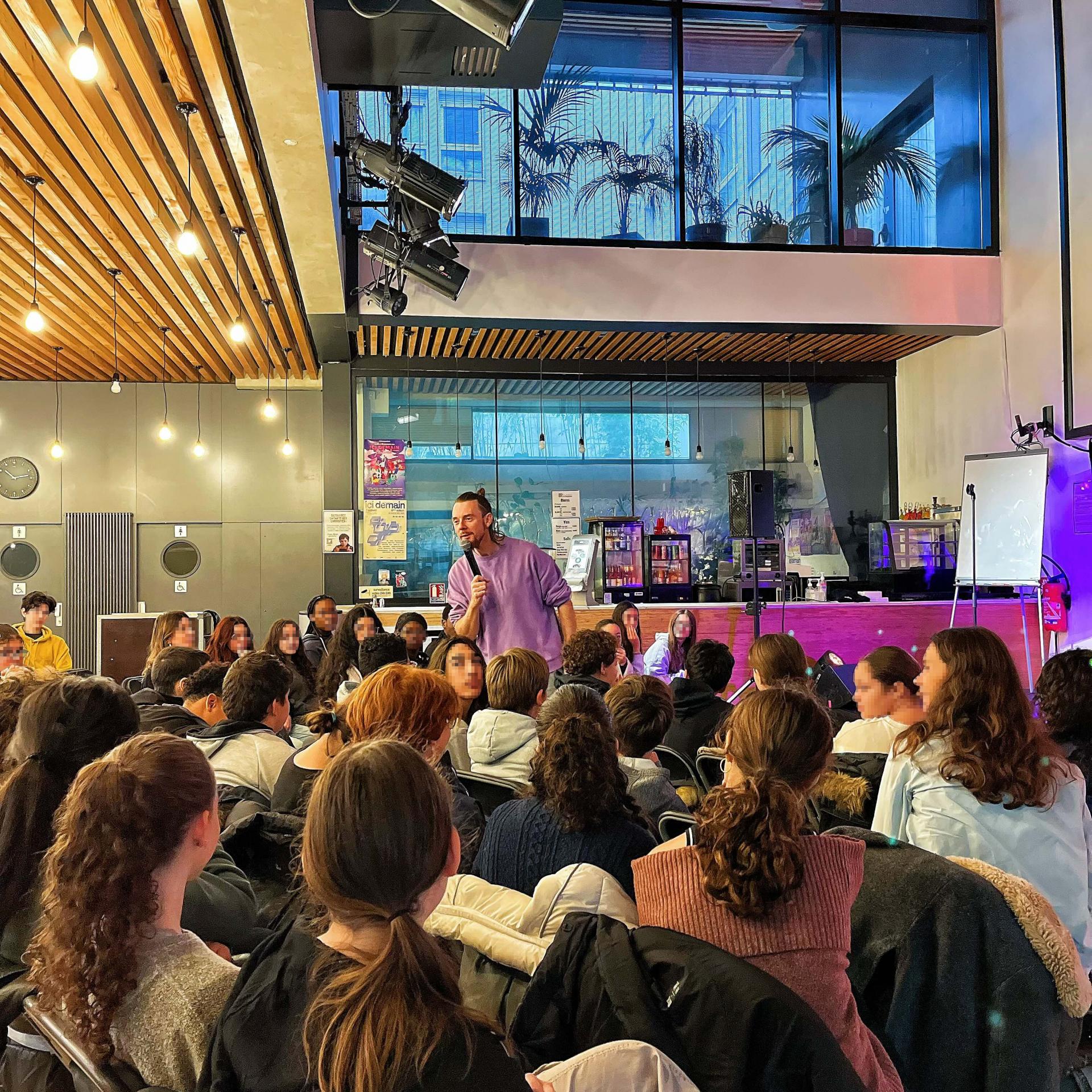 « Transformer le Négatif en Positif » est une conférence musicale interactive qui sensibilise au mal-être, à l’angoisse et au harcèlement. À travers la musique, les témoignages et les échanges, elle aborde l’acceptation de l’échec, la confiance et l’estime de soi, le regard des autres, les blessures psychologiques et la force de la singularité de chacun·e. Deux classes d’un collège inscrit au programme pHare ont pu vivre cette expérience à FGO-Barbara ce 28 novembre. Une matinée pour comprendre, ressentir et repartir plus fort·e.