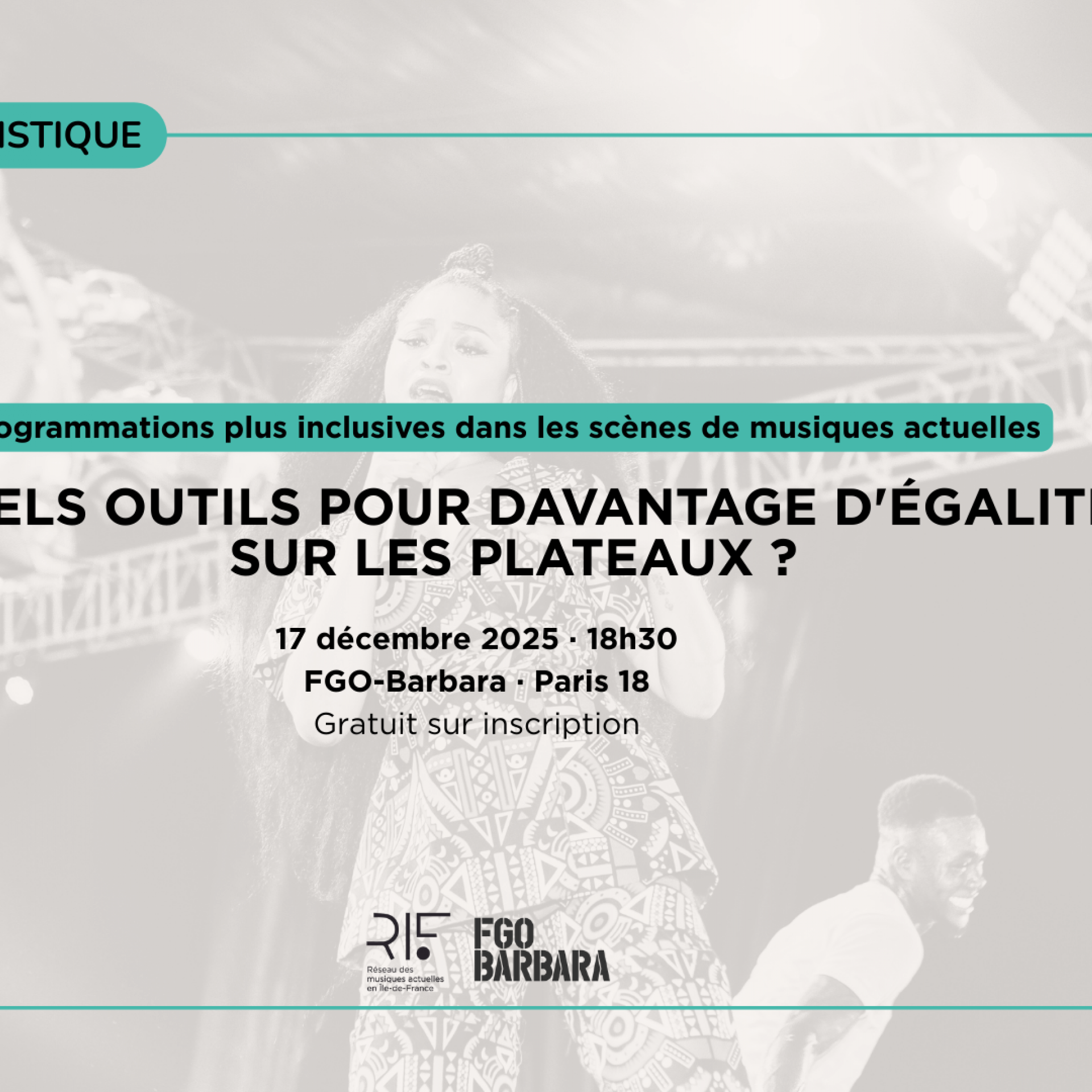 Le RIF en partenariat avec FGO-Barbara présente "Pour des programmations plus inclusives dans les scène de musiques actuelles", un cycle de rencontres qui explore les enjeux d’inclusivité et de diversité dans la programmation des musiques actuelles. À travers des temps d’échange, d’analyse et de partage d’expériences, sociologues, artistes et structures engagées viendront témoigner de démarches inspirantes et d'outils pratiques, afin d’ouvrir des perspectives et accompagner une programmation plus juste, représentative et accessible.