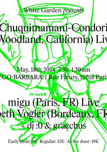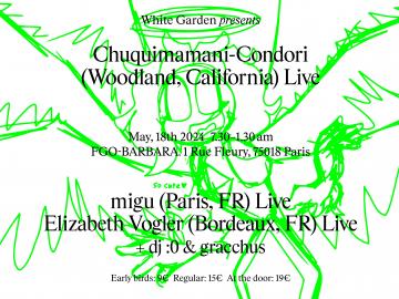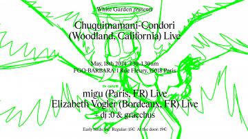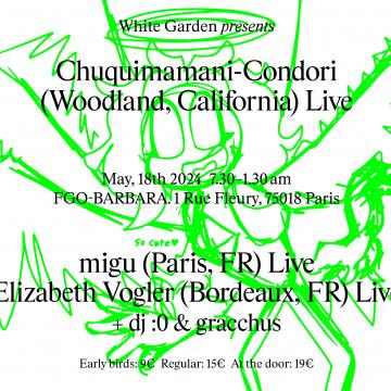 Moitié du noyau dur de White Garden, gracchus nortug et dj :0 mixeront en warm-up et closing de la soirée. Dans leurs sets les musiques méditatives peuvent côtoyer quelques bizarreries auditives issus de la culture internet. La baïle funk et la cumbia s'hybrident à la jersey ou à la trap… Il en résulte des sets très ouverts où la prise de tête n'est autorisée que si c'est pour se la balancer dans tous les sens.